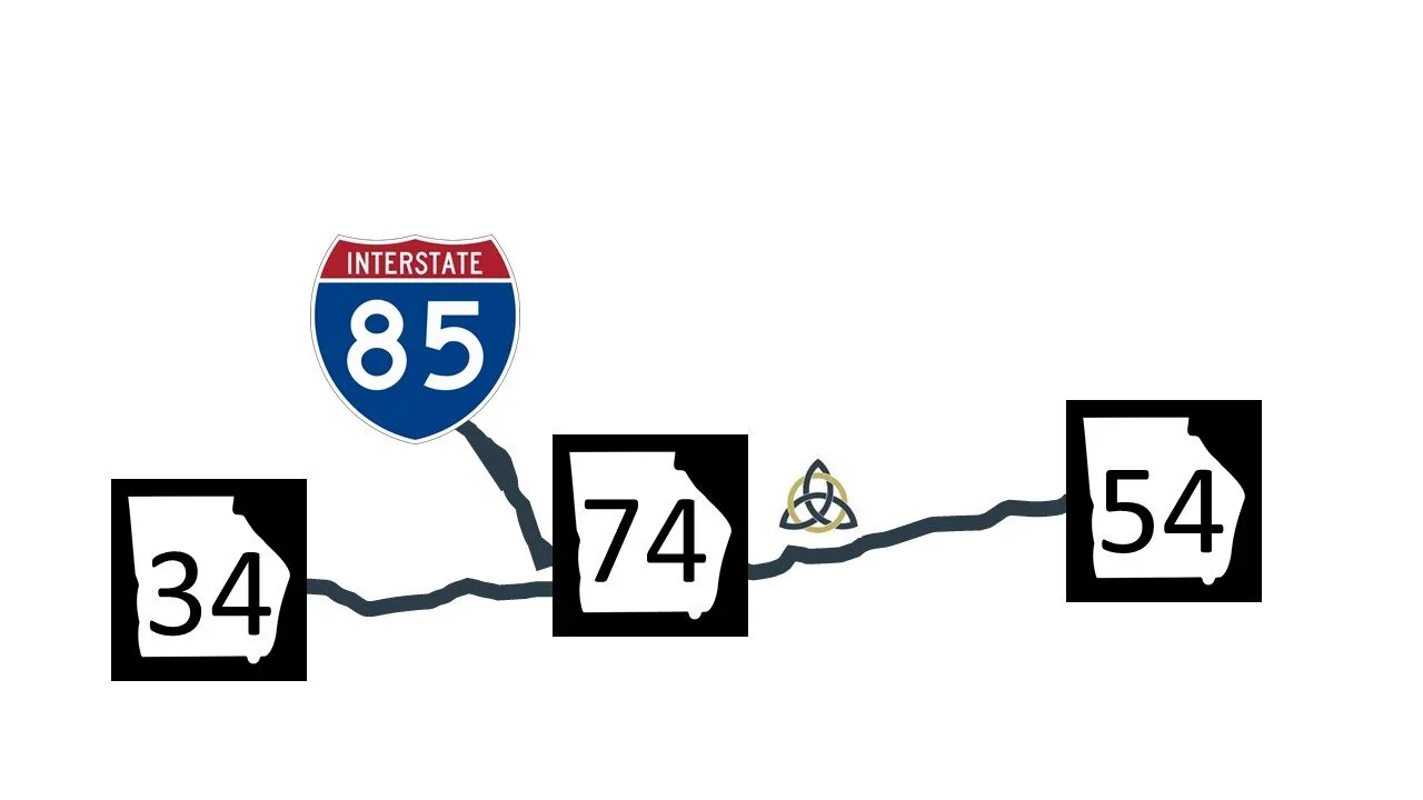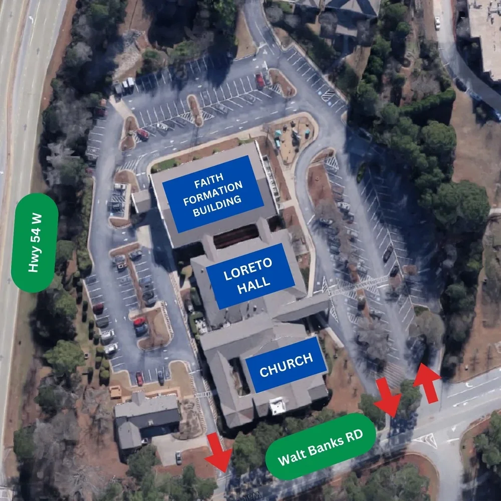 Aproximadamente 40 minutos. Tome la I-85 Sur hasta la salida 61 Fairburn/Peachtree City, gire a la izquierda en GA-74 S/Senoia Rd. (8,5 millas). Gire a la izquierda en N Peachtree Pkwy (2,5 millas), en la señal de stop gire a la izquierda en Walt Banks Rd. Holy Trinity estará a su derecha después de McIntosh High School.