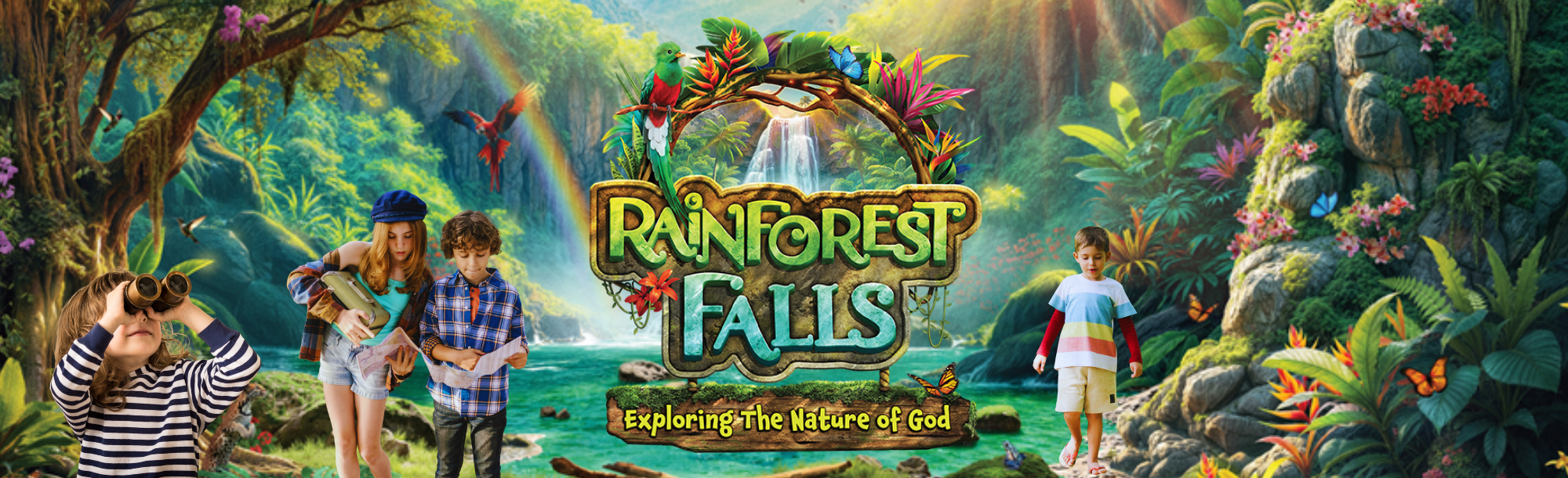Atraviesa la niebla y adéntrate en Rainforest Falls, un lugar repleto de cascadas salvajes, árboles imponentes y criaturas coloridas. Bajo un dosel de pájaros que cantan y monos que gritan, los niños se sumergen en una aventura para toda la vida en la que descubrirán la naturaleza de Dios. Explorarán lo que significa estar arraigados en una relación con Dios, su creador, un lugar seguro en las tormentas de la vida.